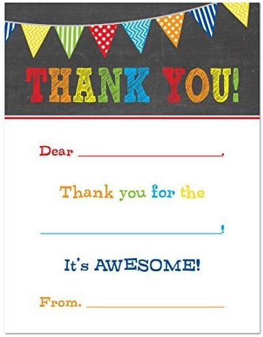 Turn writing thank yous into a fun project. Little kids will love to write on this bright colored banners over a chalkboard graphic background design. Blank print space lets you write your own message the way you want it!