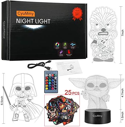 3D Star Wars Night Light Include: 3 Acrylic Plate(Kids Darth Vader, Baby Yoda and Kids Chewbacca), 1 ABS Night Lights Base, 1 Remote Control, 1 USB Cable, 25 Star Wars Stickers and a User manual.