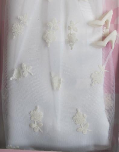 INCLUDES: white satiny Wedding Gown with tulle neckline & long sleeves & a flower pattern tulle Over-Skirt, a white tulle Veil, a Pair of white High Heel Shoes, & a Bouquet of white Flowers w/yellow & white Ribbon around Bouquet.