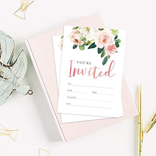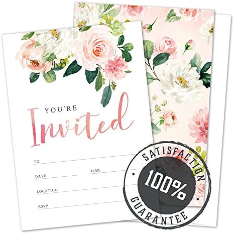 Announce your wedding, bridal shower, birthday, or gender reveal event with this pack of 25 pink floral party invitations that come along with perfectly sized white envelopes.  These lovely party invitations are perfect for baby shower, bridal shower, birthday party, wedding, engagement, reception, bachelorette party and more.  Set includes 25 Floral Party Invitations And 25 Envelopes. Fill-in style party invitation cards in size 4.1” x 5.8”. Designated space to fill in personalized event details. Made of high-quality cardstock; durable and easy to write on. Premium double-sided print. Matte finish that prevents ink smudging. Designed and manufactured in Europe. 100% satisfaction guaranteed.