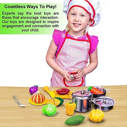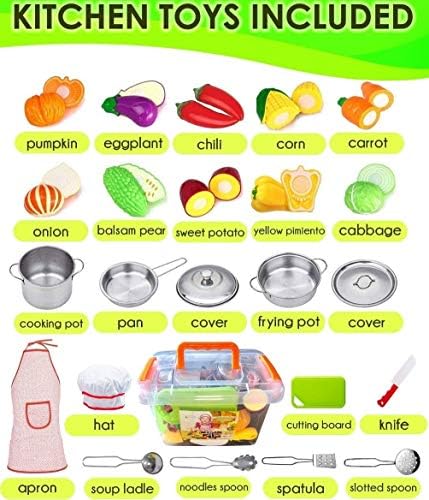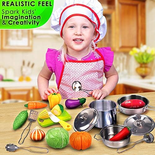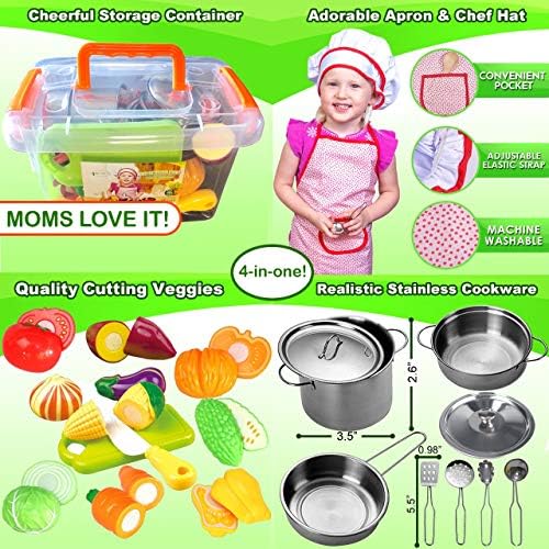 20 Pieces of food, vegetables, and fruits slices3 Stainless Pots & Pans2 Stainless Pot covers4 Stainless Cooking UtensilsApronChef HatToy plateKnife and Cutting boardCheerful storage container