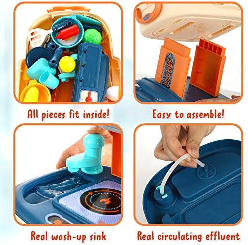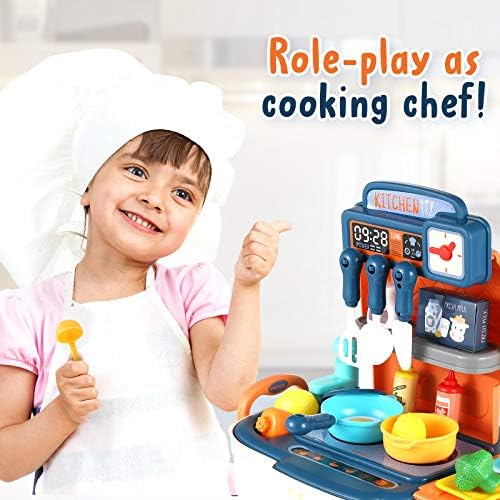 Kids Kitchen Backpack, 34pcs Kids Toys, Pretend Play Kitchen Accessories, Toddler Toy Kitchen Faucet, Play Kitchen Sink, Pretend Food for Play Kitchen, Toddler Girl Toys & Boy Kitchen Set for Kids