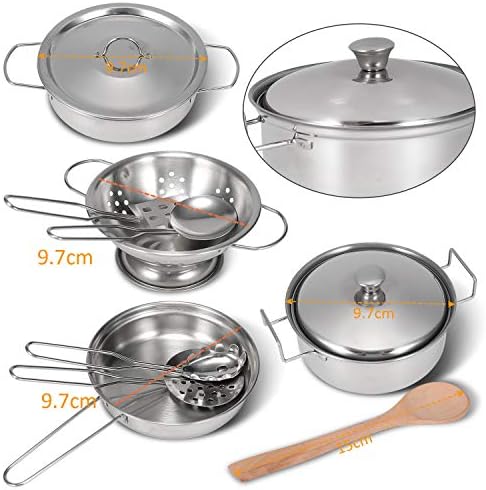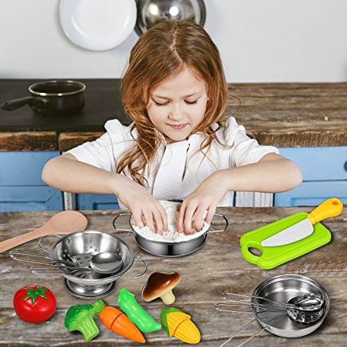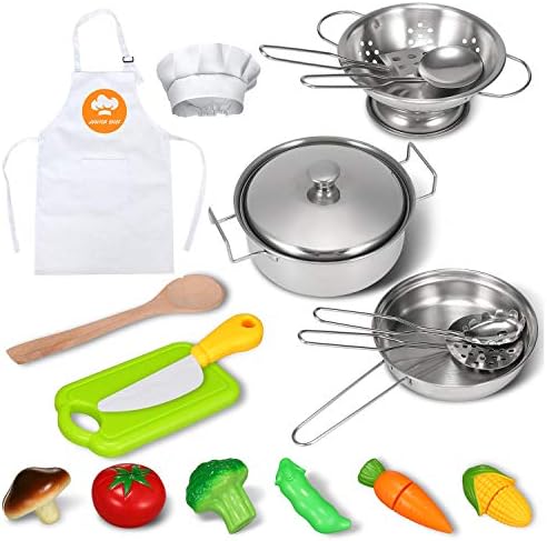 ✔COMPLETE TOY KITCHEN ACCESSORIES – Total 21 pieces include: a colander, stainless steel play pots and pans with lid and Handles, 5 cooking utensils, apron, chef hat and cutting vegetable toys.