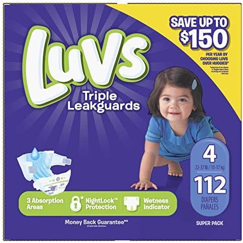 Stop leaks around the clock with Luvs. Designed with triple LeakGuards, Luvs can absorb 20x its weight and feature a wetness indicator that turns Blue when wet. When it comes to bedtime, Luvs Night lock Technology works to lock away wetness so your baby can dream On. For complete comfort, Luvs diapers are super soft on your baby’s skin with a comfy feel, plus they’re designed with larger, refastenable tabs for a secure fit. So try ’em and Luv ’em, and if you don’t, Luvs offers a money-back guarantee. Based on weight of absorbent gel. If you’re not completely satisfied, please send the original receipt and UPC to us within 45 days of purchase for a full product refund via prepaid card. Limited to one redemption per household or name. For additional details, please call 1-888-665-3257.