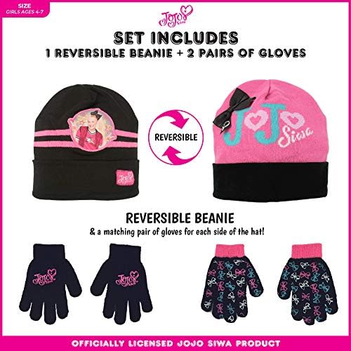 DASHING DESIGN~ Reversible girls hat and glove set includes a double-sided JoJo Siwa character hat plus 2 pairs of gloves.1 pair is Black with gripper printed bows pattern. The second pair is Black with the JoJo logo in pink.