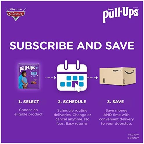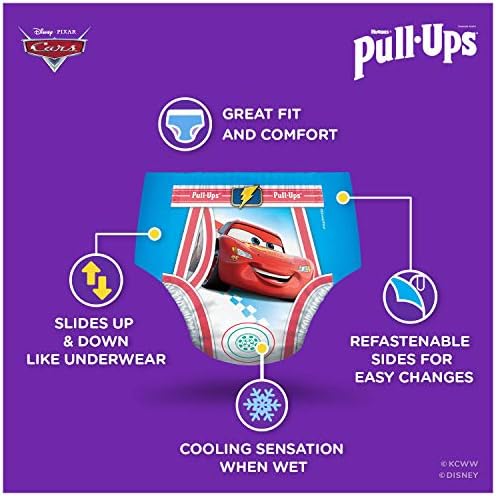 Make potty training a breeze with Pull-Ups Cool & Learn Training Pants! Featuring refastenable easy-open sides, Pull-Ups training pants allow you to keep socks, shoes and pants on your toddler for quick changes on-the-go or at home. Pull-Ups Cool & Learn provide all-around coverage with soft, stretchy sides that fit like underwear and slide up & down to promote Big Kid independence. When wet, our Cool & Learn Teaching Tool deploys a brief and gentle cooling sensation that mimics the feel of real underwear to help toddlers learn when it’s time to go potty. Pull-Ups disposable training pants also have adjustable sides to customize your child’s waistband and easily check for messes, plus added absorbency where he needs it most. Each pack includes front & back designs of Disney’s Lightning McQueen, with graphics that fade when wet to help him learn. When your child is ready to begin his potty training journey, the Pull-Ups brand can help. Visit pull-ups.com for expert articles, tips and potty training resources. We’ve helped train 50 million Big Kids and counting! Pull-Ups Cool & Learn Boys’ Training Pants are available in sizes 2T-3T (18-34 lb.), 3T-4T (32-40 lb.) and 4T-5T (38-50 lb.). Buy in bulk and save with Subscribe & Save.