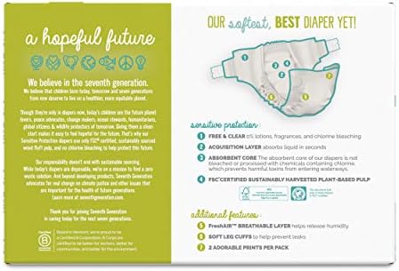 Give your newborn baby a clean, fresh start with Seventh Generation Diapers. Sensitive Protection for a happy today made with FSC® certified plant-based pulp that helps nurture a healthy tomorrow. Our absorbent core provides the long-lasting, 12-hour protection your new bundle needs, while our FreshAIRTM Breathable Layer helps release humidity. Our Sensitive Protection baby diapers are made without fragrances, lotions, or chlorine bleaching, and use only FSC® Certified, sustainably sourced wood pulp that’s gentle on our planet’s forests. Wrapped in Seventh Generation’s softest, best diaper yet—the future looks good on your new baby. Congratulations!