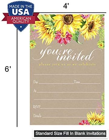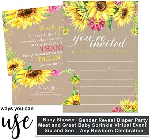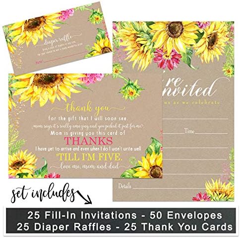Be the first to review “Sunflower Baby Shower Invitation Bundle (25 Guests) Includes Fill in Blank Invites – Diaper Raffle Inserts – Thank You Cards – White Envelopes – Rustic Fall Flower – Girls or Boys”