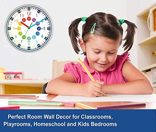 ๐ PERFECT SIZE FOR CLASSROOMS, PLAYROOMS AND KIDS BEDROOMS! Our silver frame learning clock is a 12 inch analog clock, with a clear white face and large colorful numbers and fingers