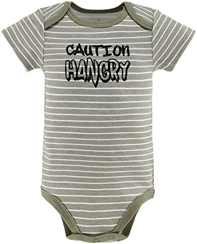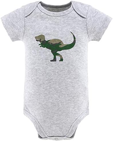 5 CUTE & PREHISTORIC DESIGNS: Styles feature playful dinosaur creatures, interplaying with a classic camo print, stripes, stylized line art, and a “Caution Hangry” slogan in shades of green, olive, and white. Your baby will always look fashionable in these designs!