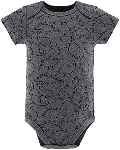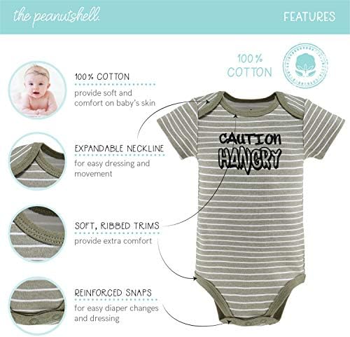 Your little one will be all snuggled up in this 5 Piece Short Sleeved Baby Bodysuit set from The Peanutshell. Styles feature playful prehistoric dinosaur, interplaying with a classic camo print, stripes, stylized line art, and a “Caution Hangry” slogan in shades of green, olive, and white. Made of super-comfy 100% cotton knit, each bodysuit is ideal for easy diaper changes and quick on & off with lap-shoulder and triple snap construction. Set of 5 will allow you to switch outfits as needed. Perfect for every day!