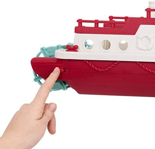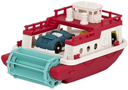 All aboard! This big and sturdy plastic toy boat comes equipped with two toy cars and hours of bath toy fun! The wind-up propeller pushes the plastic boat around the tub or pool to an imaginary vacation on a faraway Island. And, like all our best bath toys, the toy ferry boat is recyclable. The floating boat hull contains a nifty slide-out ramp—ideal for loading toy cars while your favorite animals and figurines enjoy the view from the deck above. Bold, bright colors and realistic details like side portholes, ropes, life Savers, and an anchor will make your little Sailor feel like the Captain of a real working ship. The toy ferry boat encourages children to be adventurous and playful while reducing screen time and developing fine motor skills. And, the toy ferry boat is made from safe BPA-free plastics. So, don’t miss the boat on this fun baby Bath toy!